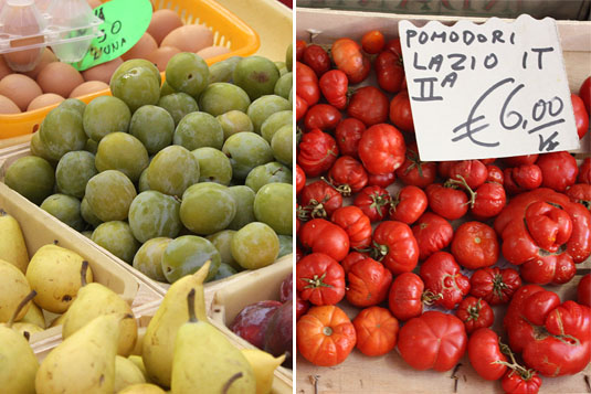 Fresh eggs, prunes, pears, and tomatoes at the market.