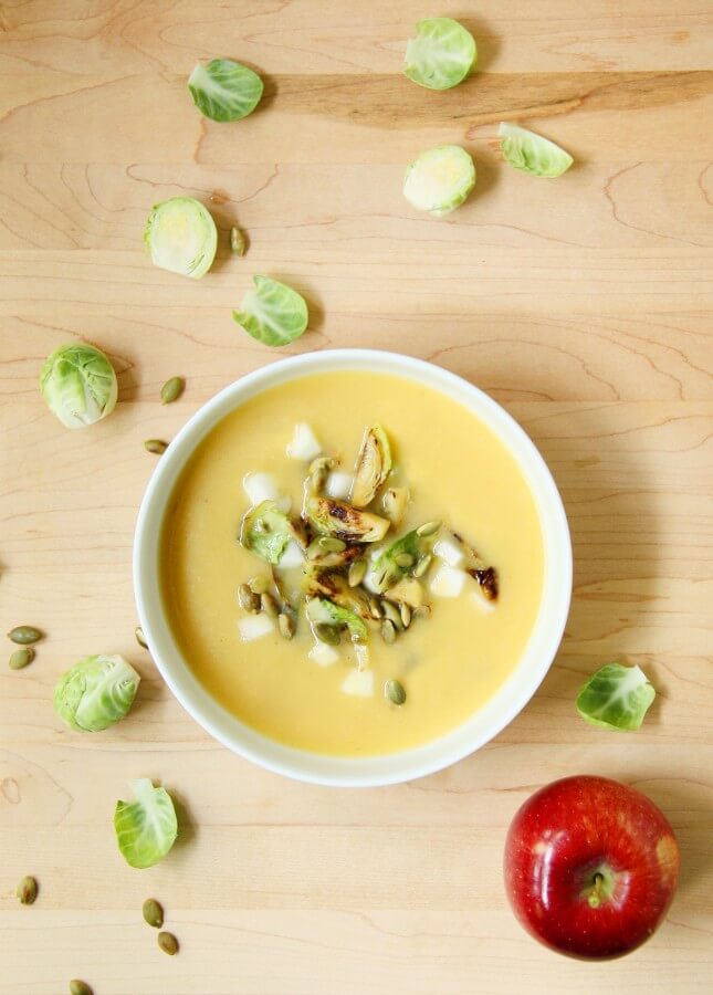 Recipe © Marie Asselin / Creamy Miso Squash Soup with Seared Brussels Sprouts and Apple / https://foodnouveau.com/miso-squash-soup-with-brussels-sprouts/